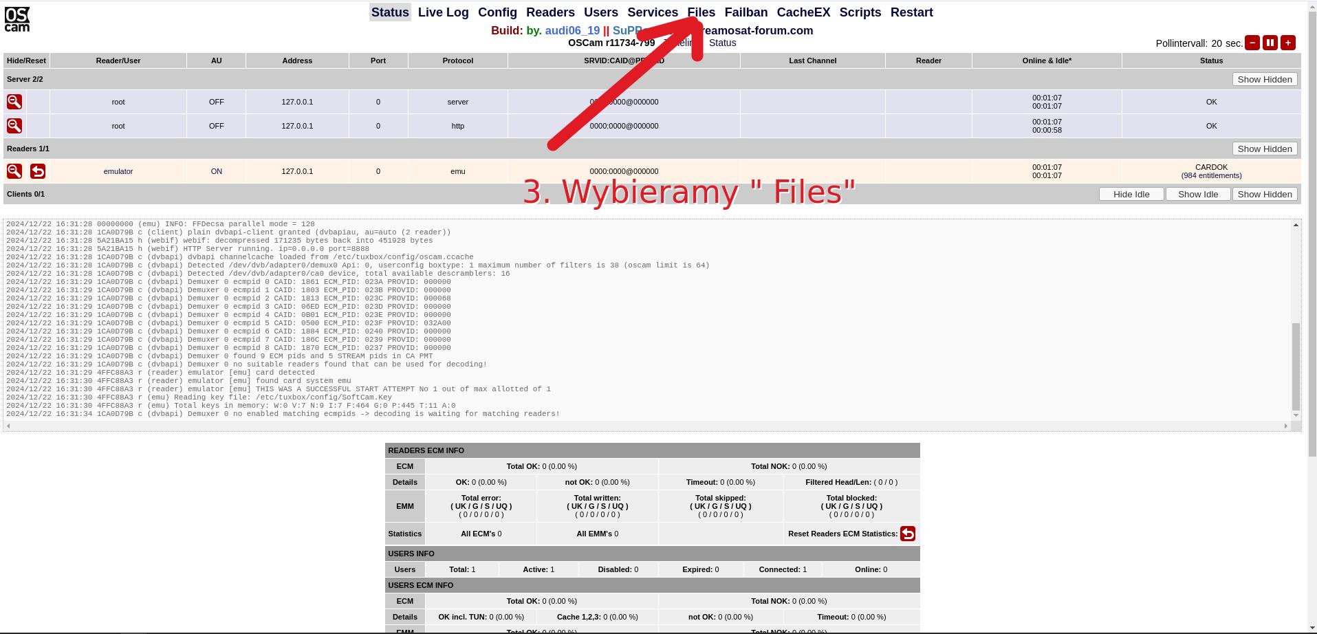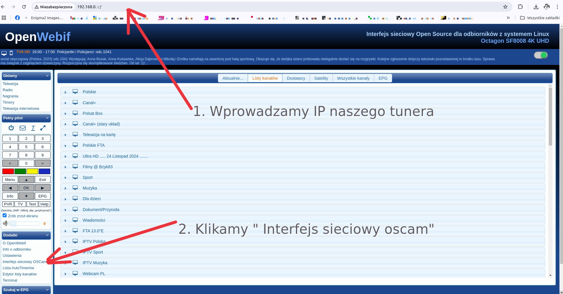 Dodawanie linii do OSCam możesz wykonać bezpośrednio z przeglądarki przez OpenWebif. Poniżej masz pełną, prostą ścieżkę od wejścia na tuner do restartu OSCam.