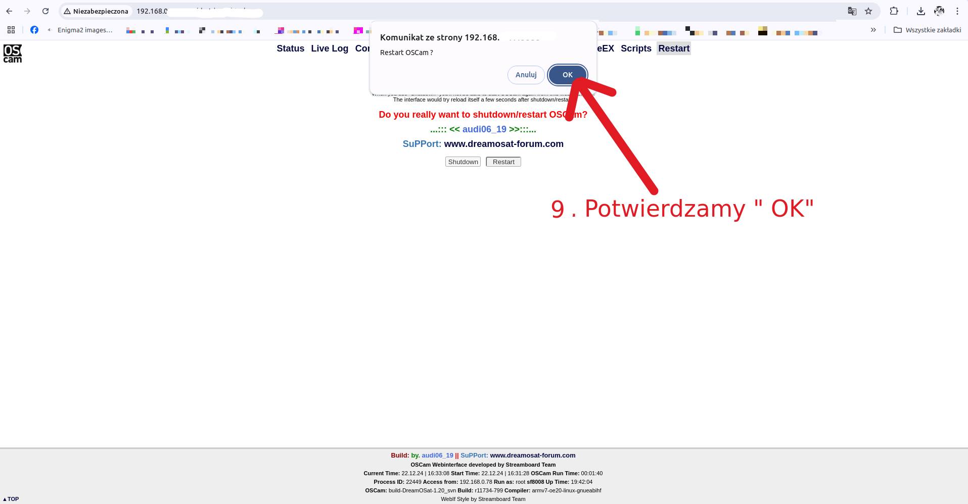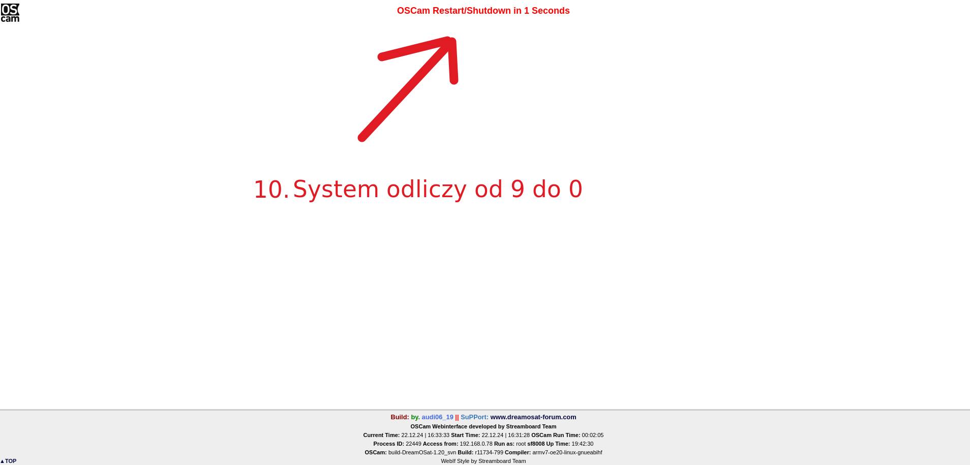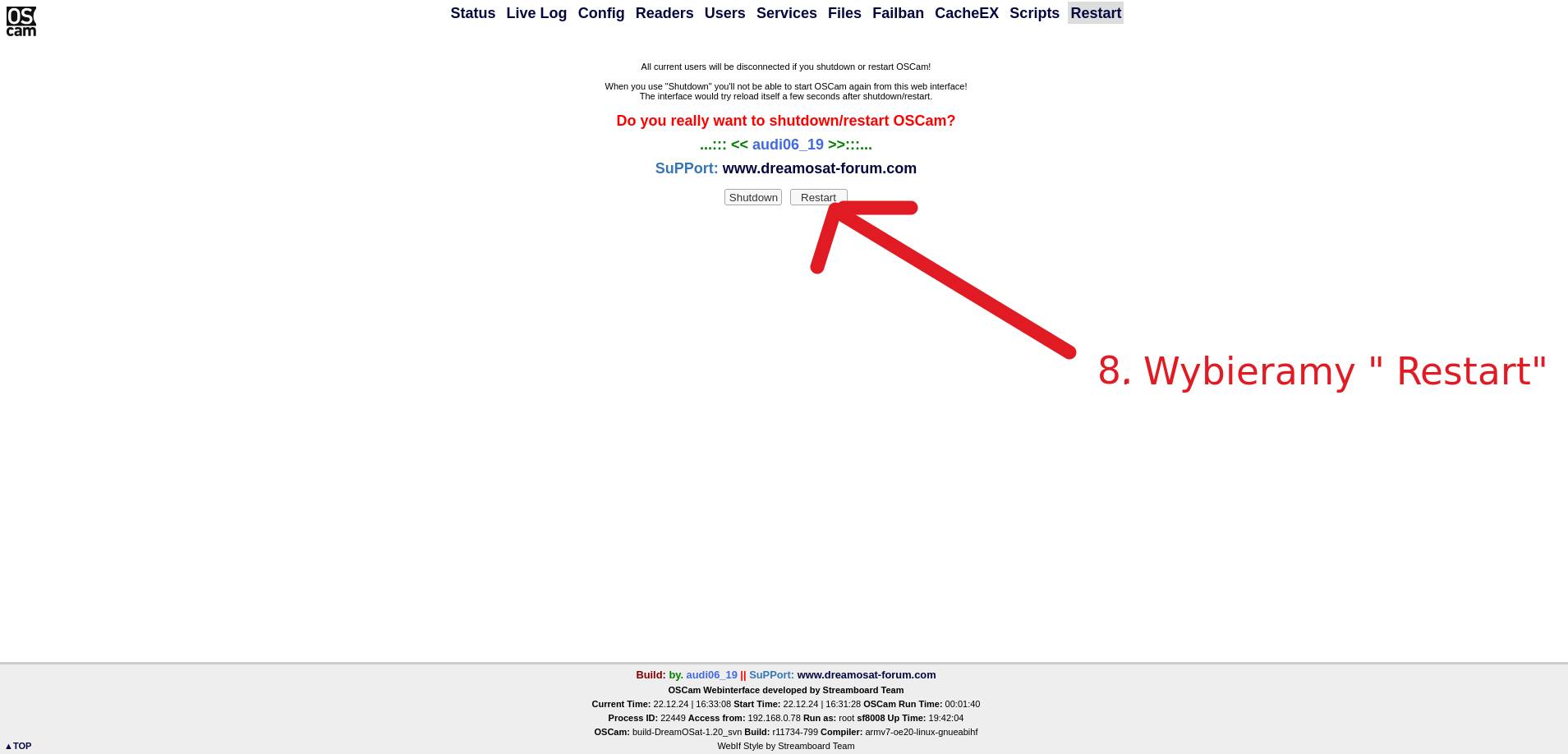 PDF z wejściem do Interfejsu sieciowego OSCam, zapisem zmian i restartem usługi.