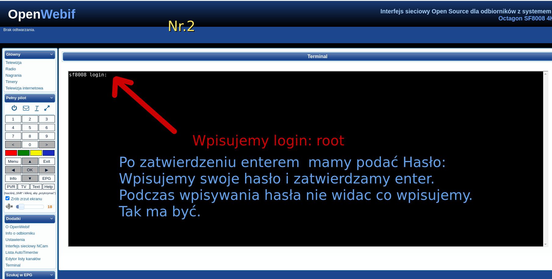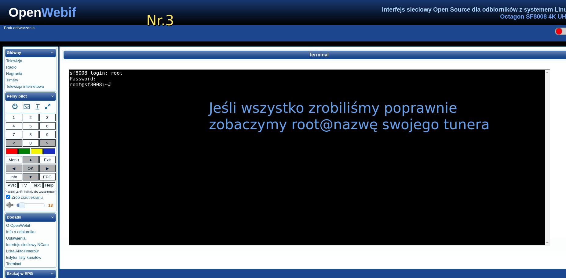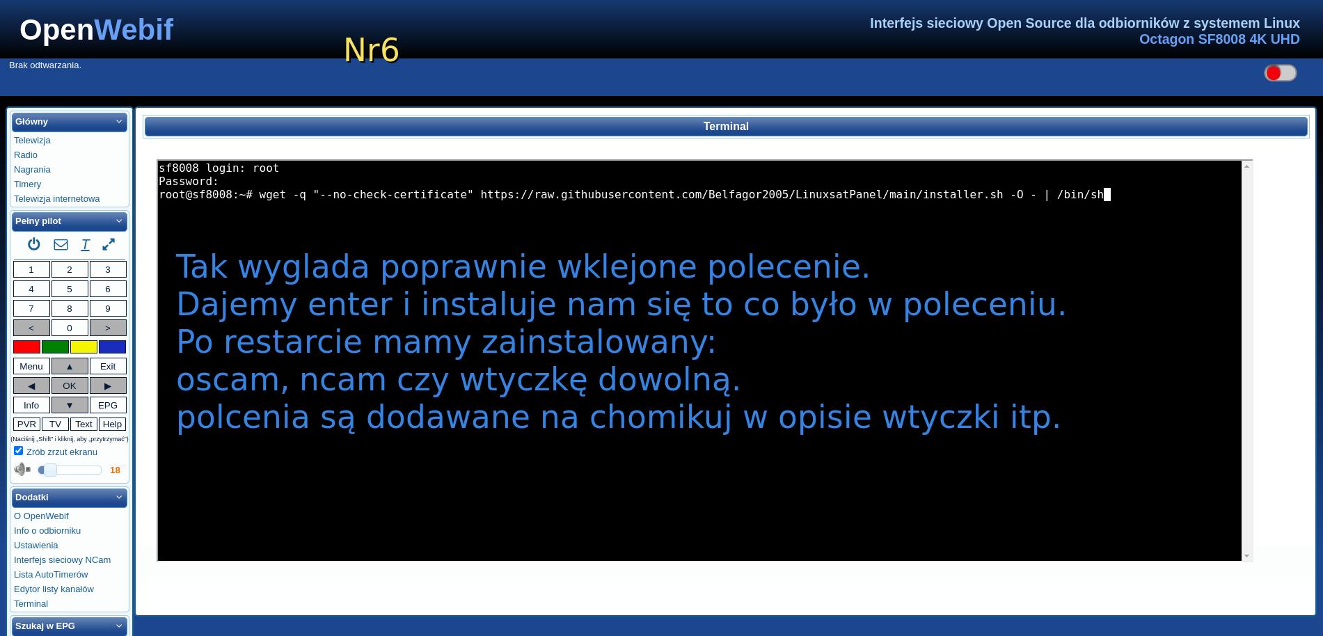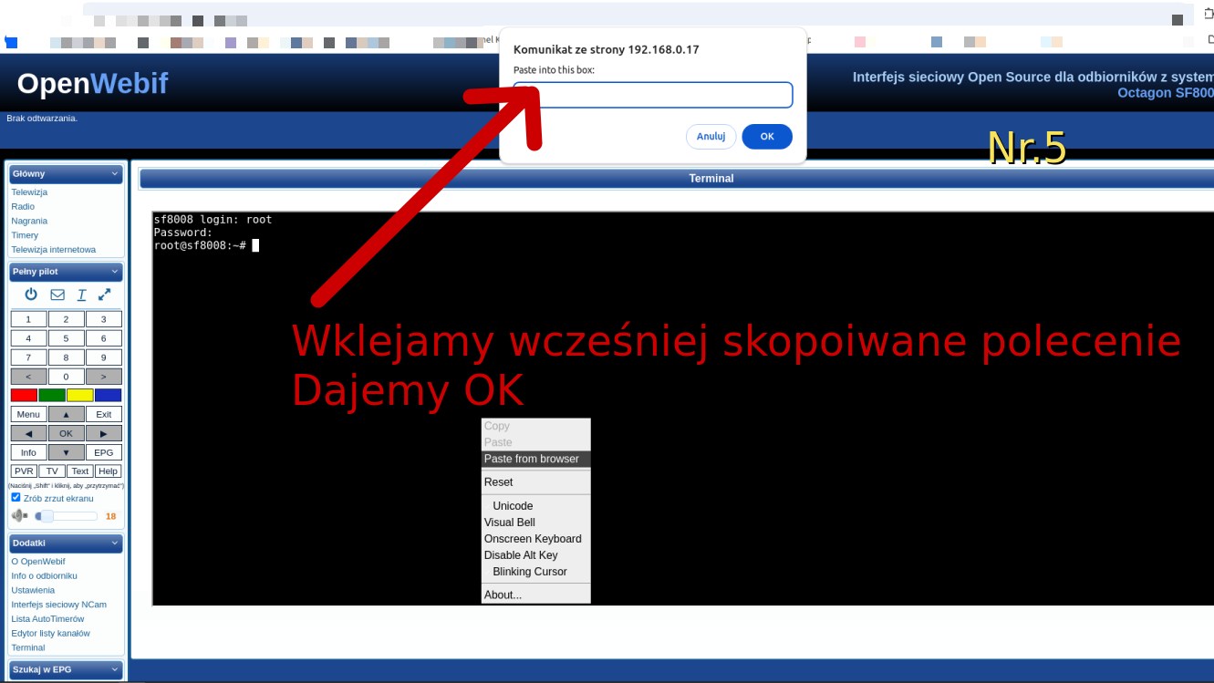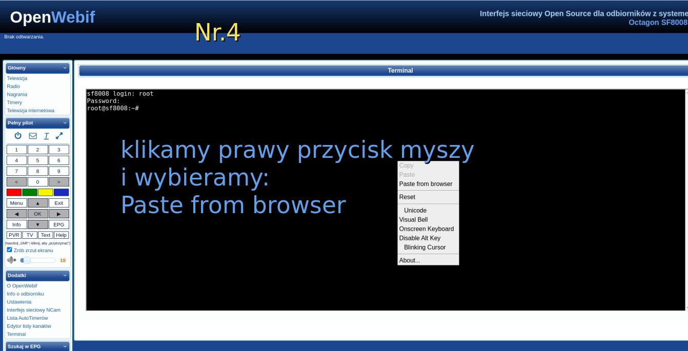 Logowanie do OpenWebif, wklejanie komendy, uruchomienie skryptu i alternatywa przez PuTTy.